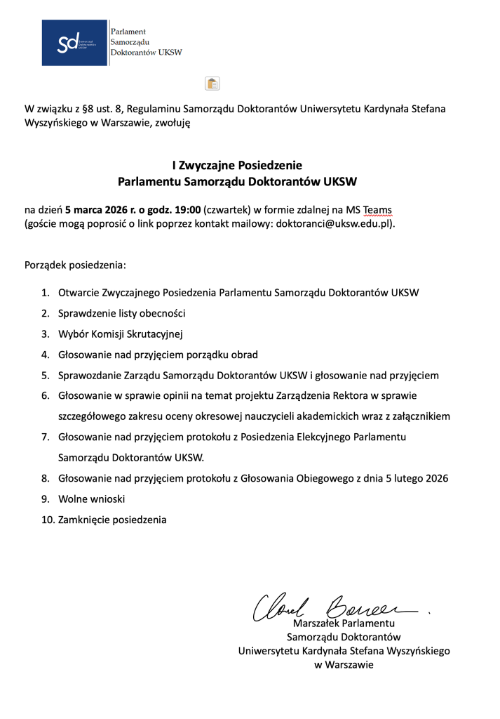 I Posiedzenie zwyczajne Parlamentu Samorządu Doktorantów UKSW